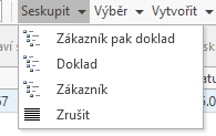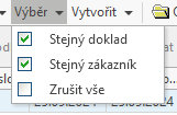 Tlačítkem výběr je možné automaticky vybrat všechny položky stejného dokladu nebo zákazníka. Vždy je třeba mít nejprve vybránu jednu položku a dle ní se pak vyberou ostatní na dokladu nebo zákazníka.