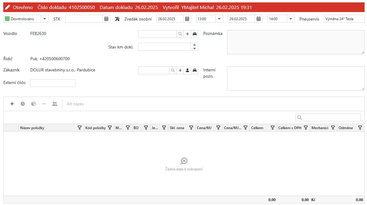 Pozn.: Pokud se nestiskne „lupa“ nebo se odpoví NE, založí se zakázka na Anonymního zákazníka a SPZ se vloží do Interní poznámky. Následně lze v zakázce založit kartu vozidla, doplnit řidiče atd.