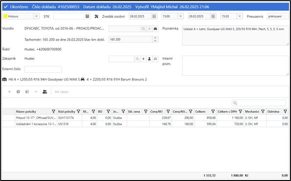 1. Otevření nebo Vytvoření nové zakázky – vozidlo má uskladněné pneu