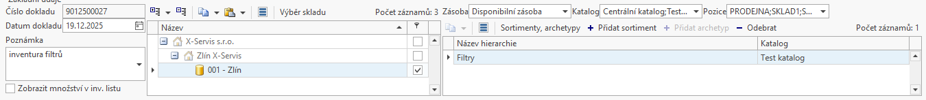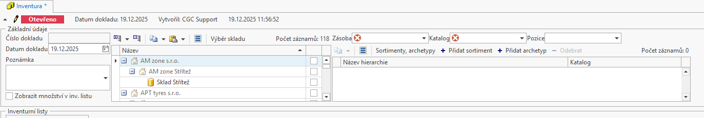Vytvořená inventura s parametry: