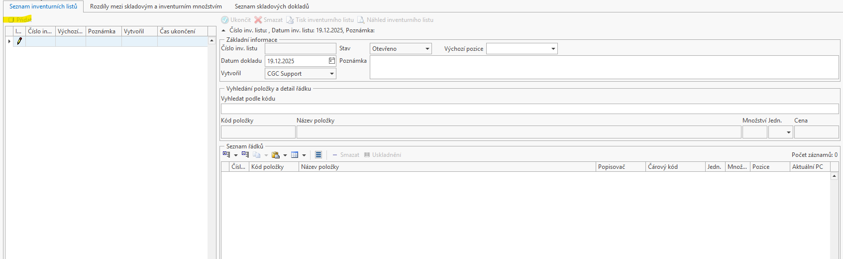 Přidání inventurního listu přes tlačítko přidat