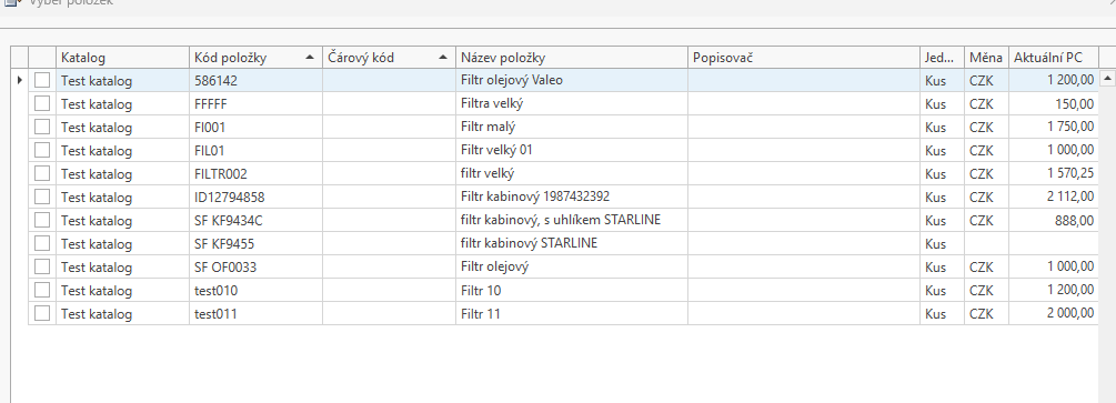- Sortimentní strom Filtry pro Test katalog