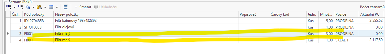 Pokud máte řízený sklad a položku máte uskladněnou na dvou různých pozicích, můžete položku narazit znovu a zvlášť přidat počet na jiné pozici: