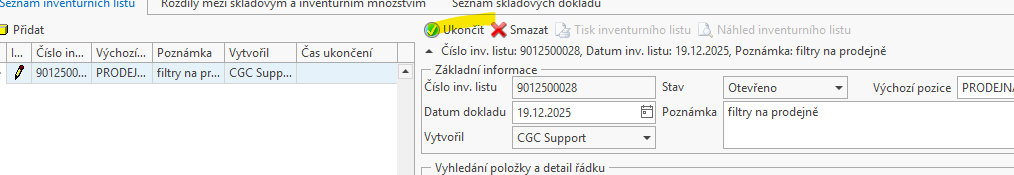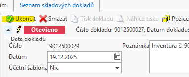 Poté co jsou dokončeny všechny vytvořené skladové doklady a máte inventuru řádně dokončenu, je možné ji následně úplně celou ukončit.