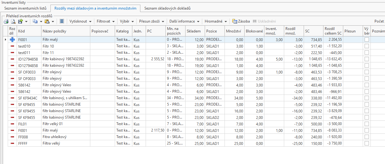 Poté je možné si vytisknout výsledné čísla z inventury a rozdíly.