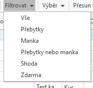 - Filtrovat = zobrazit - přebytky, manka, obojí - shoda = tzn. spočten správný stav v inventuře.