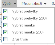 - Vyberete položky k vyřešení přes sloupec Výběr ručně nebo přes tlačítko Výběr - Vybrat přebytky nebo Vybrat manka.