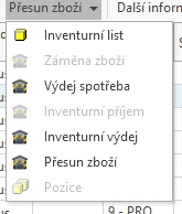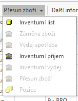 - Přebytky lze vyrovnat skladovým dokladem Interní příjem, manka Interním výdejem. Obojí je dostupné pod volbou Přesun zboží