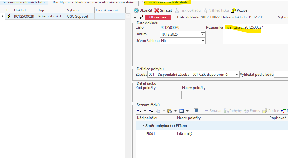 Na poslední záložce Seznam skladových dokladů se zobrazí skladové doklady, které vznikly při řešení inventurních rozdílů, zde můžete např. rozšířit poznámku, případně i přidat položky do dokladu - toto ale nedoporučujeme, pravděpodobně byste si rozbili správný stav inventury.